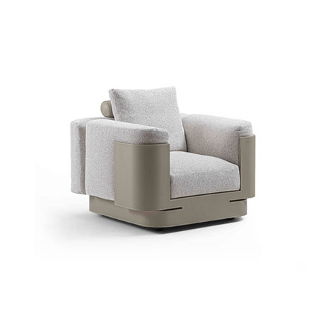 Rivestimento: fisso, disponibile in tessuto o pelle. I rulli dei cuscini schienale sono rivestiti nella stessa pelle della struttura esterna e del basamento.