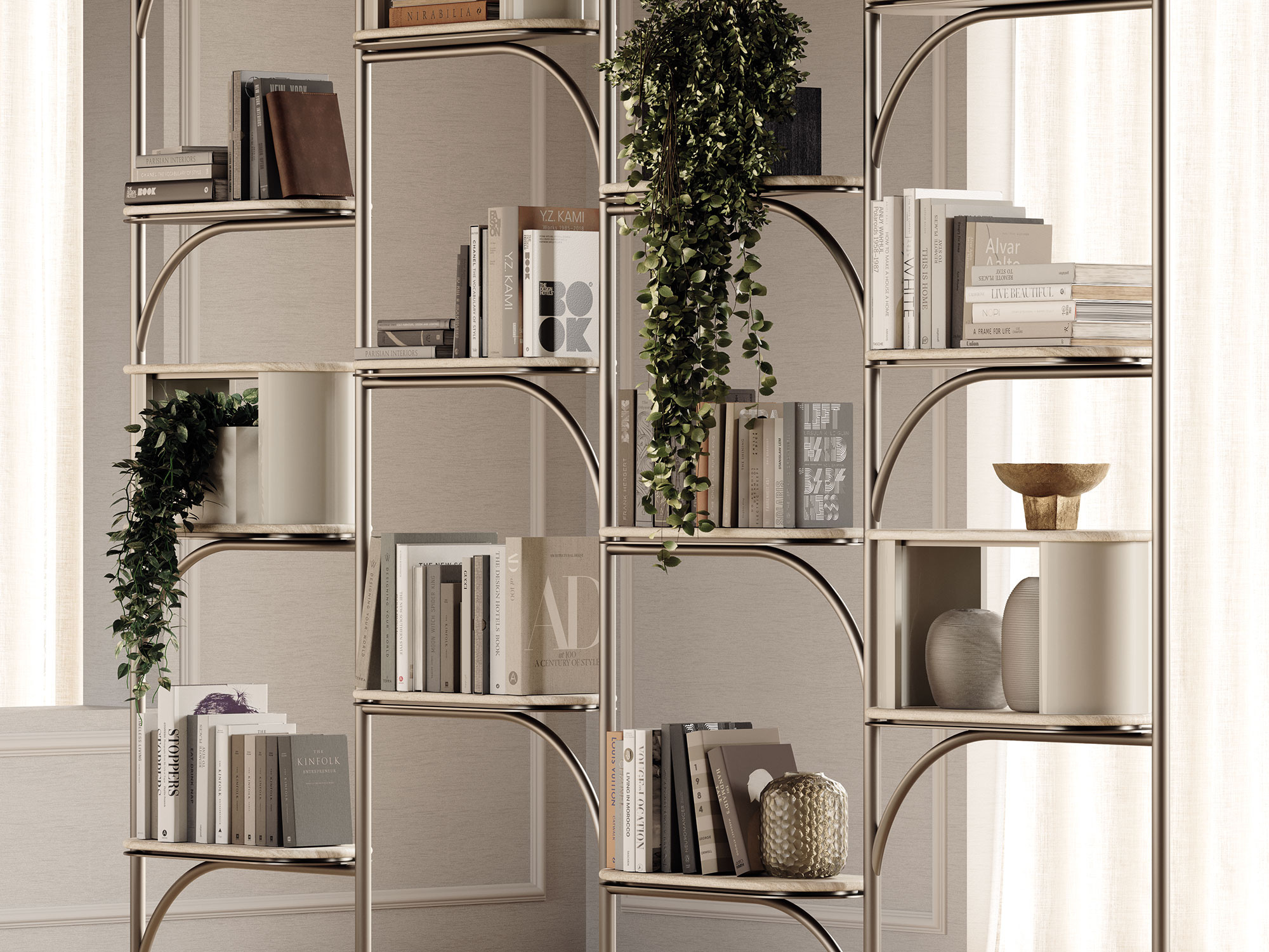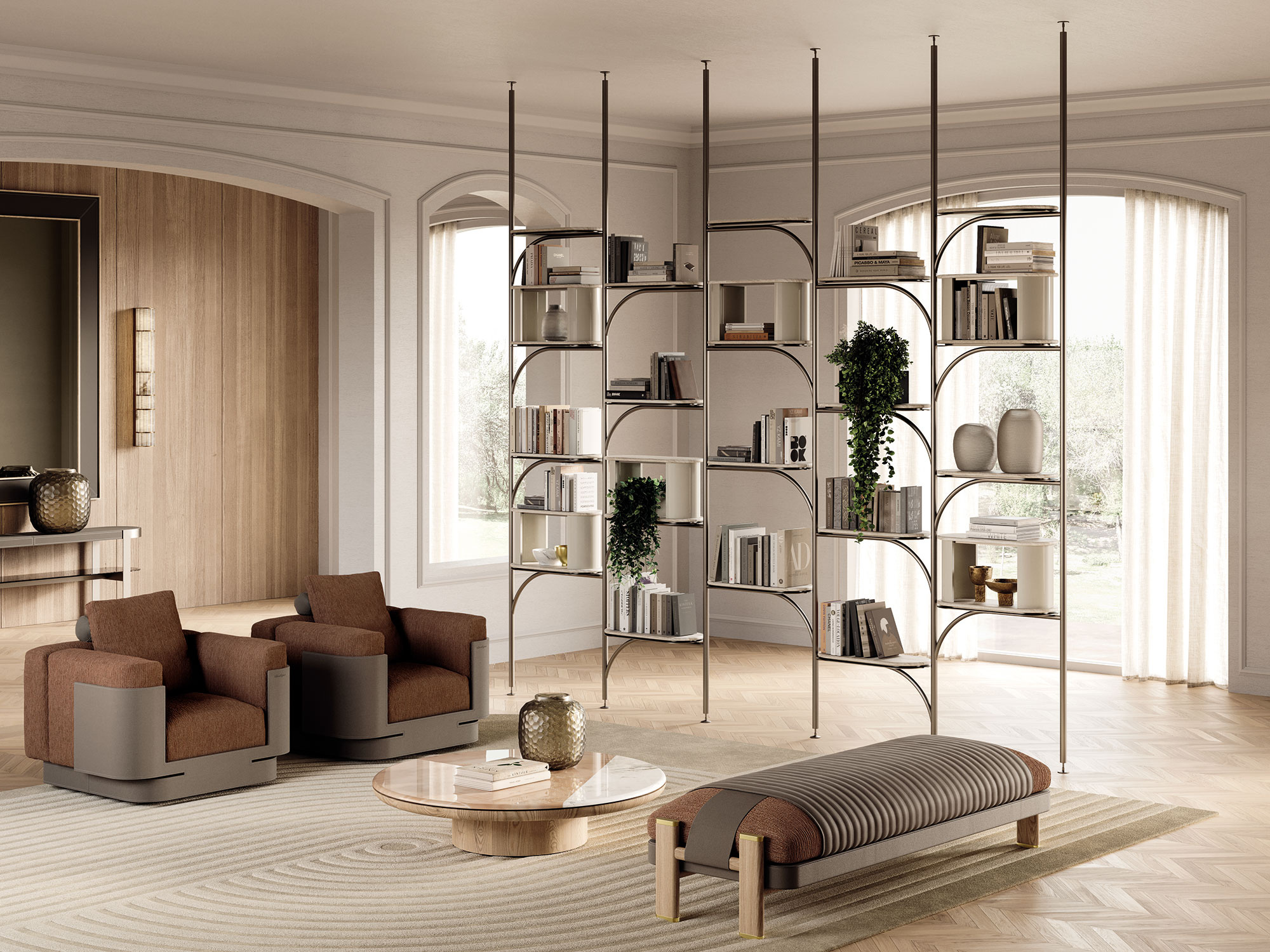 Struttura: in metallo color Brunito o metallo color Sabbia Sablé, su richiesta metallo color Burgundy Sablé, metallo color Greige Sablé, metallo color Nero Sablé o metallo color Titanio.