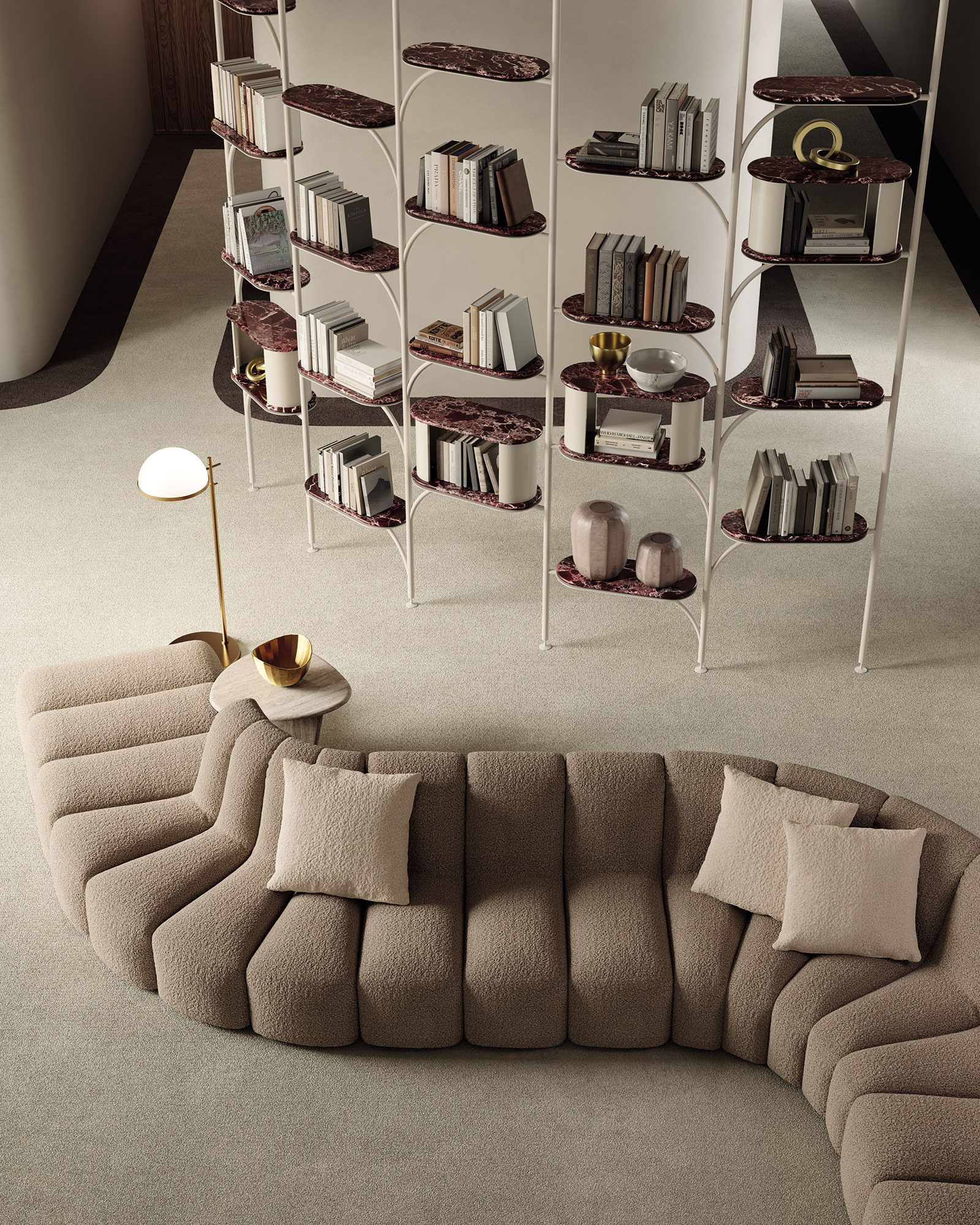 Moduli contenitore: ripiano e chiusura in marmo nei colori disponibili in collezione VF, distanziale in legno color tortora, spalle in legno curvato laccato lucido.